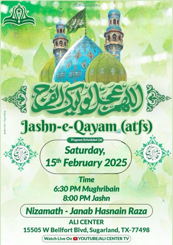 For Inforamtion please Call: Waqar Rizvi 832 567 2448, Sarwar Mahdi 832 868 0430, Shahnshah Zaidi 979 557 1816, Mukhtar Naqvi 832 602 9296, Masoom Kazmi 281 989 2732, Qamar Zaidi 832 526 2999, Shakir Jeffry 832 929 6489, Mazhar Naqvi 832 390 9951 & Zaheer Abbas Merchant 832 818 0420